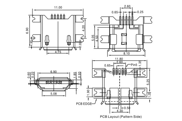 USB 2.0 connector, Micro 5P, panel-mounted type, 1.17